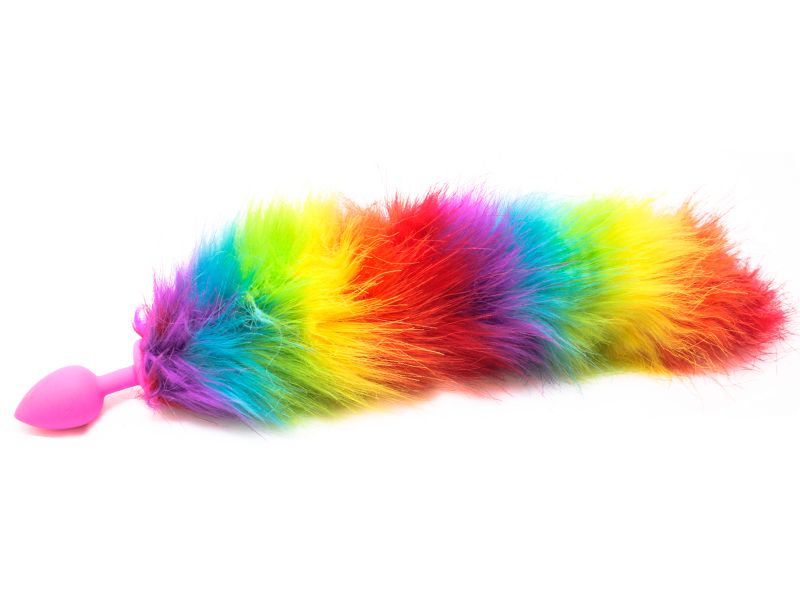 Розовая силиконовая анальная пробка с радужным хвостом размера S. Длина хвоста — 35 см. Вес — 65 гр.